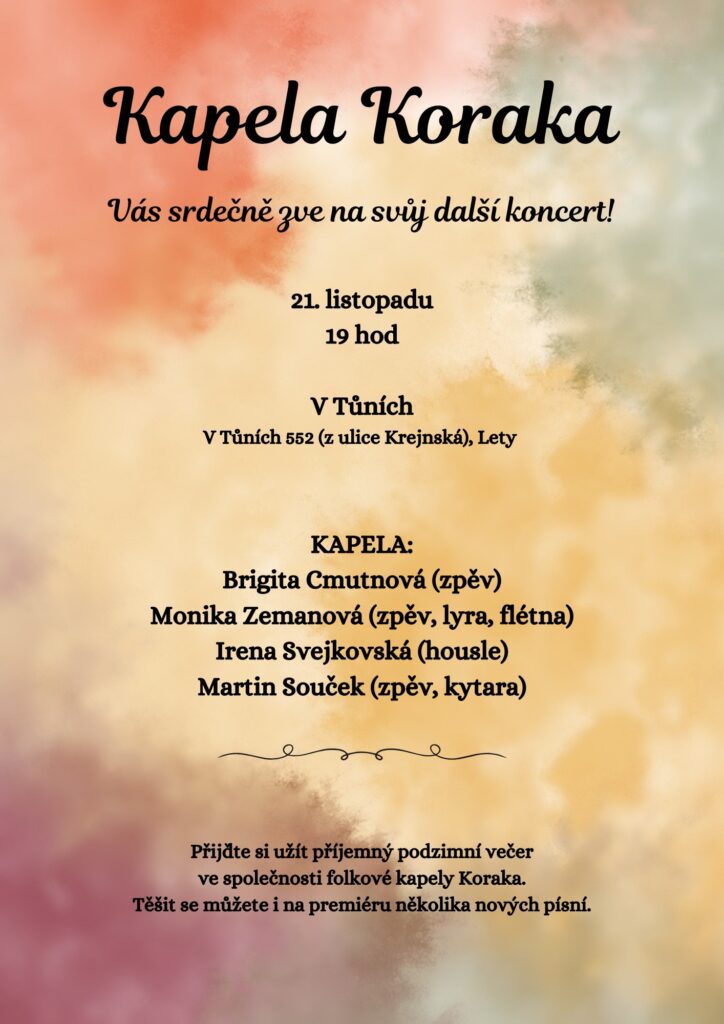 Rádi bychom Vás pozvali na náš příští koncert, který proběhne 21. listopadu od 19 hod v našich oblíbených Tůních.
